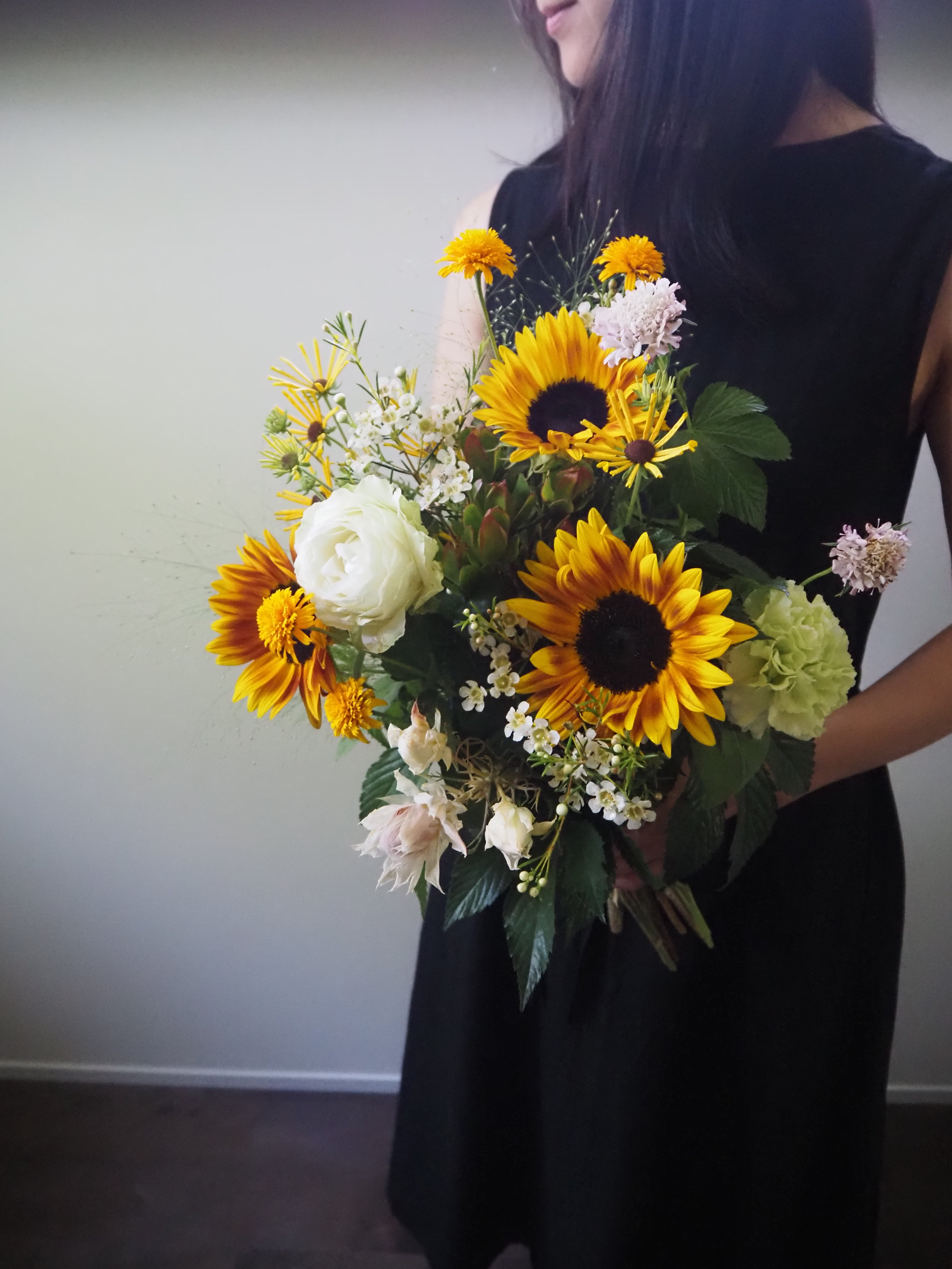 季節に合わせた花とグリーンをカジュアルに束ねてお作りいたします。
